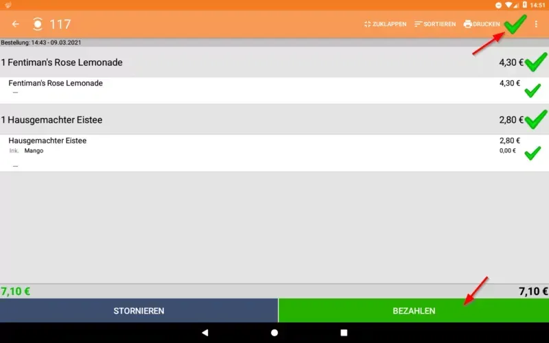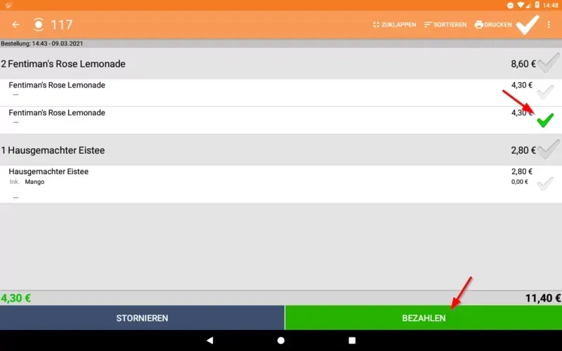 III. Jetzt wählen Sie jene Artikel aus, die Sie zunächst kassieren möchten und tippen auf “Bezahlen”.