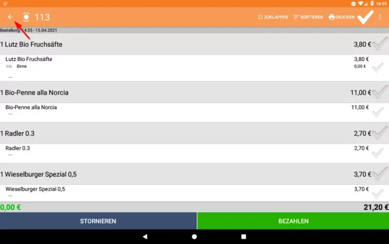 VI. Wenn Sie den gesamten Tisch storniert haben, gelangen Sie automatisch auf die Bonieroberfläche zurück. Wenn Sie nur einzelne Artikel storniert haben, tippen Sie auf den Pfeil links oben, um zur Tischansicht zurückzukehren.