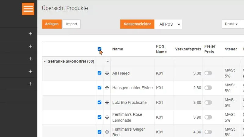 VII. Setzen Sie den Haken beim Kästchen ganz oben über den Gruppen, um alle aufgeklappten Produkte anzuwählen.
